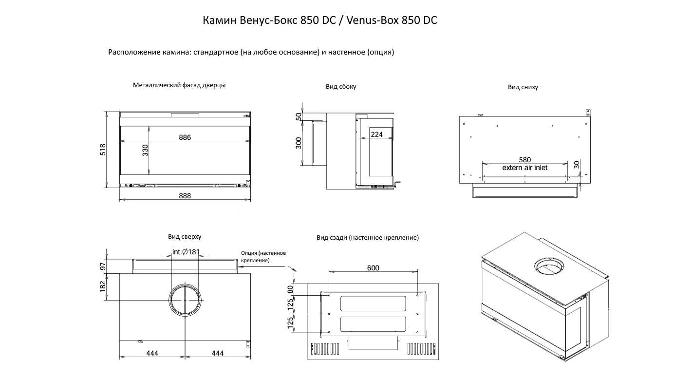 Схема камина Venus-Box 850 DC (стандартное и настенное расположение)