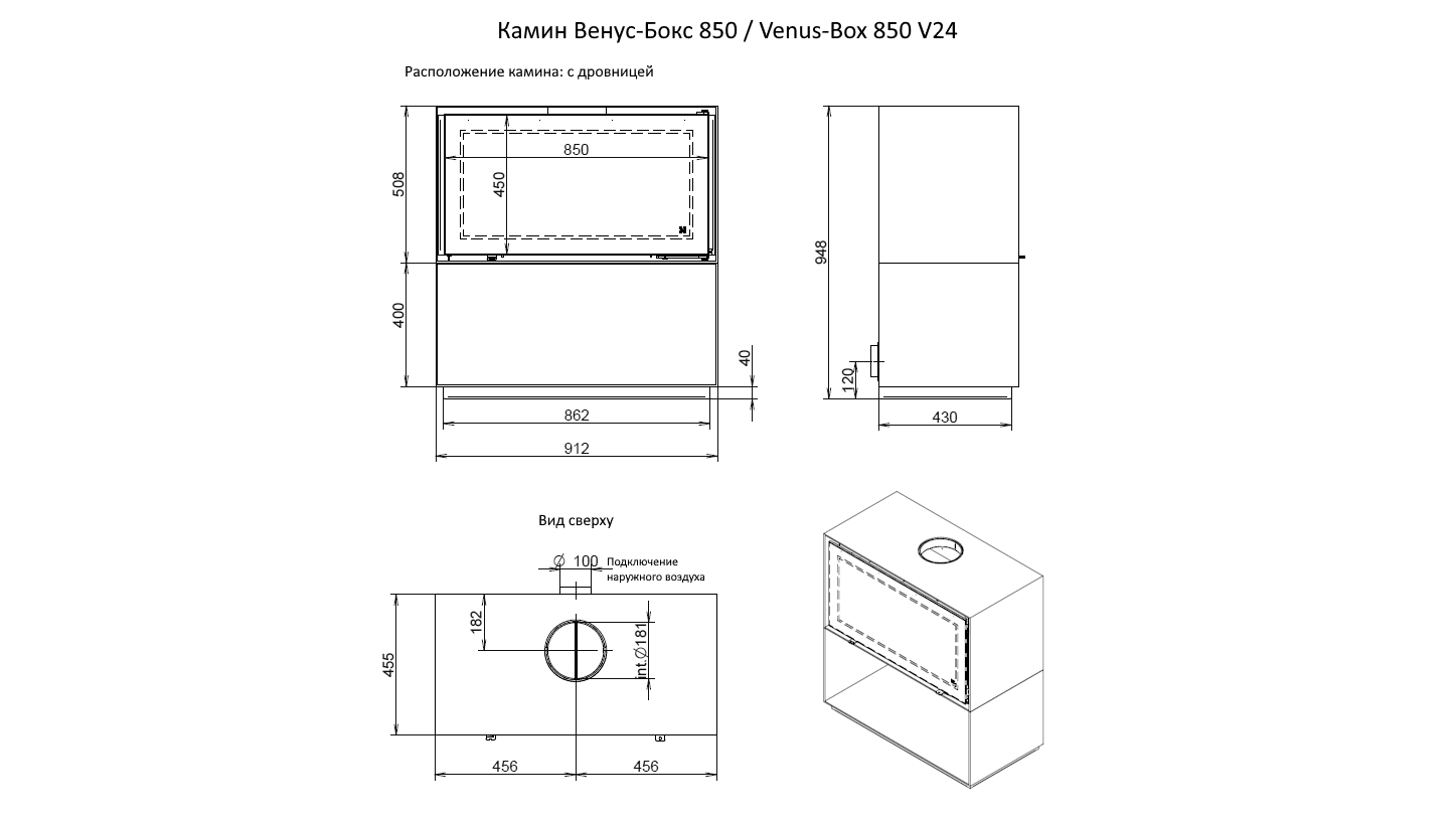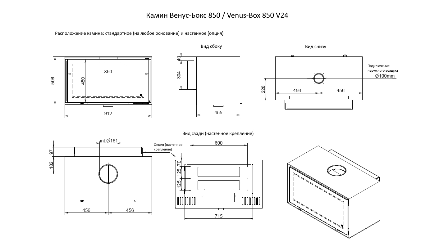 Схема камина Venus-Box 850 (стандартное и настенное расположение)