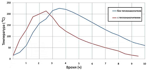 Печь (камин) может быть укомплектована теплонакопительным блоком (опция). Теплонакопительный блок устанавливается в верхней части печи. Он повышает теплоотдачу и позволяет значительно увеличить время излучения тепла печью (график излучения тепла печью с теплонакопителем и без него). В печах с теплонакопительным блоком, можно использовать или отключать режим накопления тепла с помощью задвижки управления конвекционным воздухом.